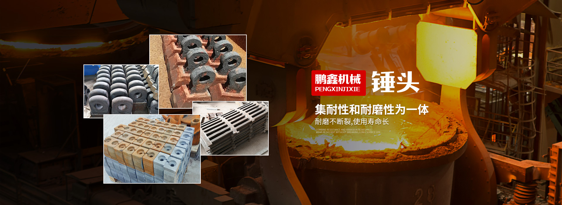鞏義市鵬鑫鑄造有限公司主要生產制砂機錘頭、高鉻錘頭、高錳鋼錘頭、襯板、鄂板、鑄造板錘、高鉻板錘、破碎機板錘、反擊破板錘、球磨機襯板、顎式破碎機鄂板(牙板、齒板),邊護板(叉板)、肘板、對輥破碎機(雙輥破碎機)輥皮、輥殼、雷蒙磨配件(磨輥磨環)等礦山配件,還可根據客戶需要定制各種耐磨鑄件、鑄鋼件、灰鐵鑄件、生鐵鑄件,歡迎來電來函咨詢!